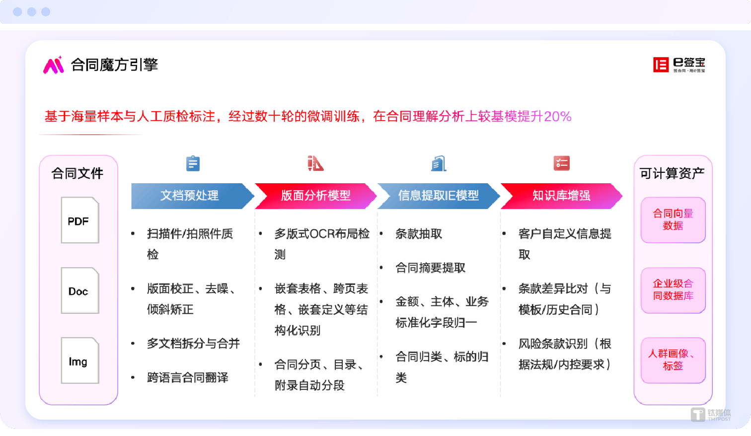 回望e签宝23年的成长过程,早已超越产物取利润本身,而是源自于23年深耕合同这一高复杂度法令场景所锻制出的一套闭环、自研、持续进化的智能系统。e签宝的AI处理方案已深度渗入至政务、金融、能源、制制等多个环节范畴。